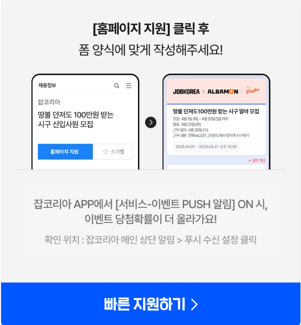 지금 바로 @jobkorea_albamon 인스타그램 프로필 링크를 클릭해 지원서를 작성하면 끝!
