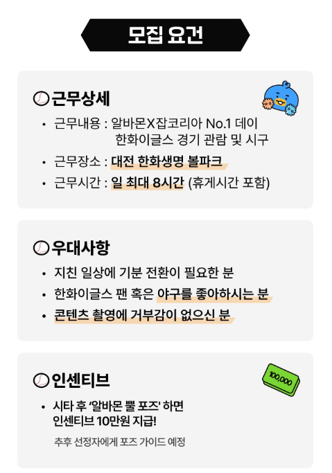 잡코리아X알바몬에서 제공하는 이번 알바는 야구팬이라면 절대 놓치면 안 될 기회예요!