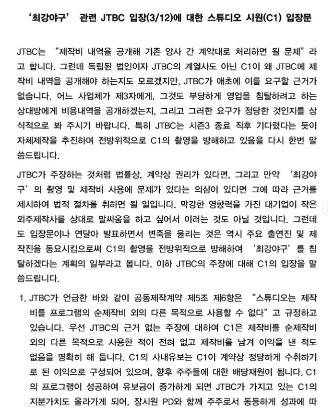 반면, C1은 JTBC의 주장을 전면 반박했습니다. 계약 구조상 과다 청구는 불가능하며, 오히려 결방분은 자비로 부담했다고 주장하며 법적 대응을 예고했습니다. 제작사 측은 공동제작계약 제6조를 근거로, 제작비 사용이 모두 정당했다고 강조하고 있습니다.