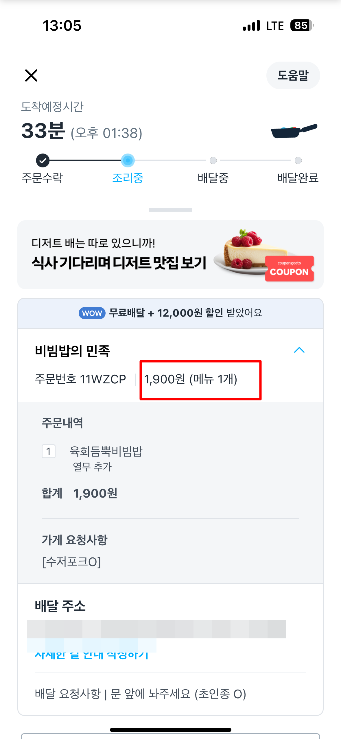 ✔ 와우회원 전용 쿠폰 활용 – 배달비 무료 + 추가 할인